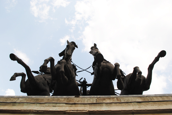 In 1912, thanks to the support of King Edward VII (initially as Prince of Wales), the space was occupied with Adrian Jones’ sculpture of four horses pulling a chariot (known as a quadriga) driven by a boy with a winged figure representing peace standing behind him. It remains to this day.