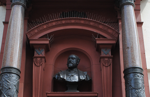 And the answer is…that the picture shows a publicly-funded memorial to Sir Augustus Henry Glossop Harris, a former manager of the Theatre Royal Drury Lane, located outside the theatre itself. Harris, who bore the nickname “the father of modern pantomime”, co-wrote and produced many productions and was also a member of the London County Council as well as a sheriff.