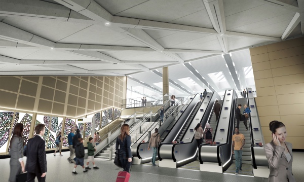 the walls of the station’s western ticket hall in what has been described as a “huge glazed frieze”. Each ‘gem’ will be created using special paint and then backlit so it shimmers and appears three dimensional. Periton is also creating a work of art for the station’s eastern ticket hall which will see exterior glazing being placed on three sides of the building featuring an intricate pattern reminiscent of the elaborate Victorian-era metalwork of the historic Smithfield Market found opposite. Says the artist: “The feel of each site is very different. The artwork for the Eastern Ticket Hall is visually more organic. Not only does the intricate pattern reflect the elaborate Victorian metalwork of Smithfield Market, it also references fragmented elements of the fauna and flora sold traditionally in the market. The design for this site is printed to emulate etched glass. The artwork design for the Western Ticket Hall is based on a large faceted diamond. A series of these giant gems cascade down and spin around the concourse, animating the space and echoing the movement of commuters. This design will be printed in bright coloured ceramic inks.” The artworks are just a couple of the many being incorporated into the new Elizabeth line stations under the Crossrail Art Programme. For more, see www.crossrail.co.uk/. PICTURES: Courtesy of Crossrail