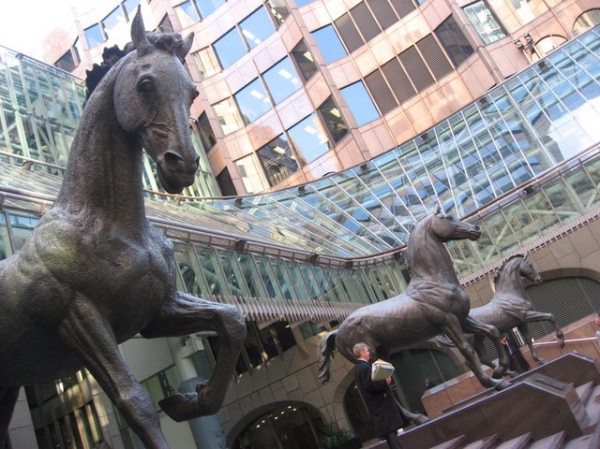 Among more modern buildings hosted in the one-way lane today is the Minster Court complex, dating from the early Nineties, which features in the forecourt facing out to the lane, Althea Wynne’s sculpture of three larger than life-size bronze horses, apparently nicknamed “Dollar”, “Yen” and “Stirling” (pictured). The building featured in the 1996 film, 101 Dalmatians.
