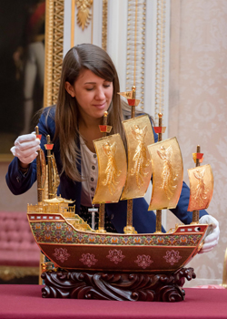 The exchanging of gifts on Queen Elizabeth II’s official engagements both in the UK and overseas is the subject of a special exhibition at this year’s summer opening of the Buckingham Palace State Rooms. Displayed throughout the rooms are more than 250 objects from more than 100 countries and territories and among the gifts on show is the Vessel of Friendship (pictured), a model of a 15th century ‘treasure ship’ sailed by Chinese navigator and diplomat Zeng He which was presented to the Queen by President Xi Jinping of China during a State Visit to Buckingham Palace in October, 2015. There’s also a colourful beaded Yoruba throne presented to the Queen by the people of Nigeria in 1956, a pair of baskets woven from coconut leaves given by Queen Salote Tupou III of Tonga during a visit by the Queen and Duke of Edinburgh in 1953, and a wooden totem pole presented to the Queen during a visit to Canada in 1971. Royal Gifts can be seen at the palace from Saturday until 1st October. Admission charge applies. For more, see www.royalcollection.org.uk. PICTURE: Royal Collection Trust/© Her Majesty Queen Elizabeth II 2017.