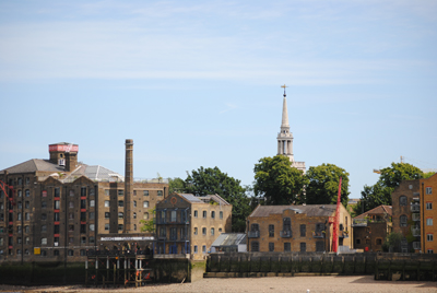 Pictured is the south bank of the Thames showing the buildings of the former Thames Tunnel Mills (now converted to residences). The tower of the Church of St Mary the Virgin is in the background – the church dates from 1716 and was designed by John James, an associate of Sir Christopher Wren.