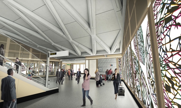The Hatton Garden diamond district is the inspiration behind a new work by artist Simon Periton which will appear inside the new Elizabeth Line station at Farringdon when it opens in December, 2018. A series of giant gems will appear to tumble down and along the walls of the station’s western ticket hall in what has been described as a “huge glazed frieze”. Each ‘gem’ will be created using special paint and then backlit so it shimmers and appears three dimensional. Periton is also creating a work of art for the station’s eastern ticket hall which will see exterior glazing being placed on three sides of the building featuring an intricate pattern reminiscent of the elaborate Victorian-era metalwork of the historic Smithfield Market found opposite. Says the artist: “The feel of each site is very different. The artwork for the Eastern Ticket Hall is visually more organic. Not only does the intricate pattern reflect the elaborate Victorian metalwork of Smithfield Market, it also references fragmented elements of the fauna and flora sold traditionally in the market. The design for this site is printed to emulate etched glass. The artwork design for the Western Ticket Hall is based on a large faceted diamond. A series of these giant gems cascade down and spin around the concourse, animating the space and echoing the movement of commuters. This design will be printed in bright coloured ceramic inks.” The artworks are just a couple of the many being incorporated into the new Elizabeth line stations under the Crossrail Art Programme. For more, see www.crossrail.co.uk/. PICTURES: Courtesy of Crossrail