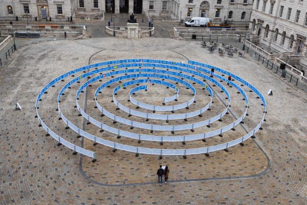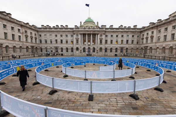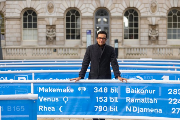 A new art installation – Jitish Kallat’s Whorled (Here After Here After Here) – has been unveiled at Somerset House. The work, located in the Edmond J Safra Fountain Court, is more than 30 metres in diameter and comprises two intersecting spirals that represent a “seismic ripple” or a galactic whorl which spirals outwards from the centre of the courtyard. The work, which draws upon sacred geometry and alchemical diagrams, features two 168 metre scrolls which follows the visual language of UK motorway signage. As visitors walk through the spirals, they are taken on a journey past signs indicating the distance from Somerset House to more than 300 locations across the planet and beyond including celestial bodies, such as the Moon, Mars, and distant stars in the Milky Way. The installation is free to see until 23rd April.