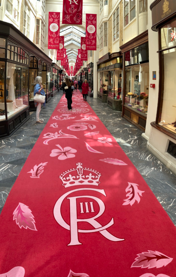 The Burlington Arcade rolls out the red carpet with the new King’s cipher. PICTURE: Matt Brown (licensed under CC BY 2.0)
