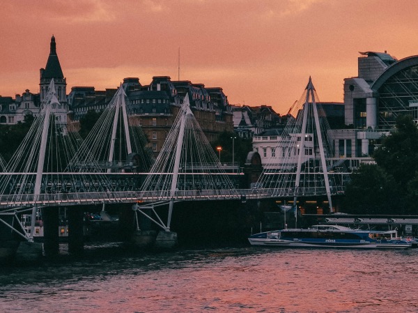 The Hungerford Bridge, flanked by the two Golden Jubilee Bridges, and the north-west bank of the Thames.