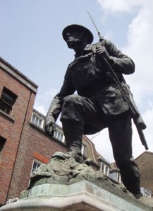 But the best, I believe, are the ones celebrating the common soldier. I have some favourites. The City of London Regiment infantryman atop a tall plinth in Holborn by Albert Toft (1922), dramatically standing tall, his rifle by his side, bayonet fixed. In Borough High Street there is a fine statue by P Lindsay Clark (1922), remembering the men from St Saviour’s (pictured, right). It is of a soldier, rifle slung, purposefully leaning forward as he trudges through the mud. A very recent statue unveiled by the Queen in 2000 is of a five-man tank crew, in Whitehall Place very near Embankment Station. By Vivien Mallock, it gives a very strong feeling of cameraderie and I always find it uplifting when walking by.