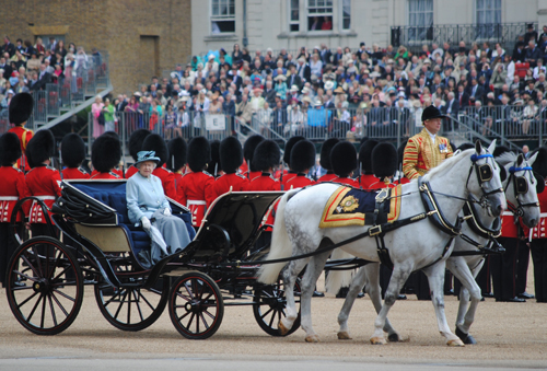 Queen Elizabeth II inspects the Guards in her phaeton.