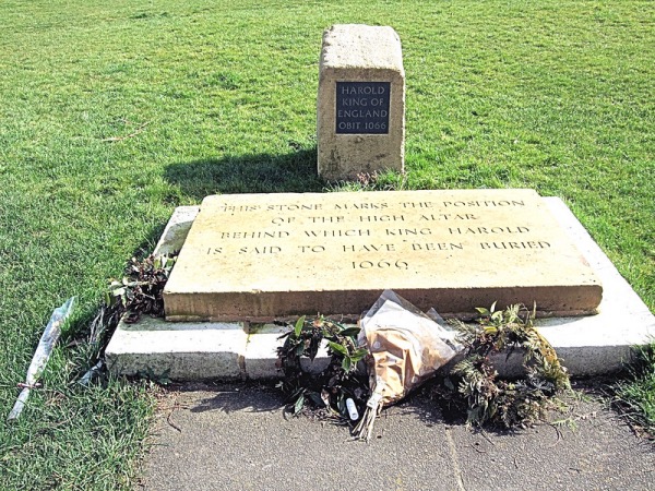 The grave is marked by a memorial stone now located in the churchyard which was erected in 1960. The inscription says the stone marks the position of the former church’s high altar. King Harold is said to have been buried behind this in 1066 after he was killed, according to tradition, by a well-aimed arrow to the eye at the Battle of Hastings (the church was rebuilt in the 12th century which explains why the altar is now located outside).