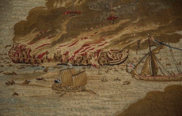 Commissioned by King Charles II and his brother, James, Duke of York (later King James II), the tapestry – known as The Burning of the Royal James at the Battle of Solebay, 28 May 1672 – commemorates the Battle of Solebay, a naval battle fought in Southwold Bay off the coast of Suffolk on 28th May, 1672. The first battle of the Third Anglo-Dutch War, it ended with both sides claiming victory and was the final naval battle in which James was engaged.