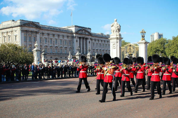 The main ceremonial Changing of the Guard today takes place at Buckingham Palace. It involves the Old Guard (those currently on duty, including the detachment from St James’s Palace) forming up in front of the palace and being relieved by the New Guard which has marched from Wellington Barracks, off Birdcage Walk, with a band which plays New Guard’s Regimental Slow March as it advances towards the Old Guard.