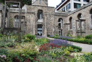 The church was not rebuilt and the parish merged with the nearby St Sepulchre-without-Newgate – the largest parish church in London – and eventually what’s left of the church – the tower with rebuilt steeple and the west and north walls – were converted into a public garden (rose beds were planted where the pews once stood and there are wooden towers representing the church’s pillars). Pictured right, it’s now a terrific place to sit and have lunch pondering the past which the bustle of the city goes on about you.