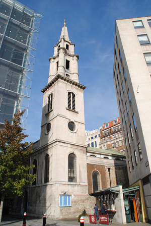 Given the demands of Wren’s time elsewhere, it’s not known if he personally designed the resulting church (the spire is possibly the work of Nicholas Hawksmoor), but the church was rebuilt and stood until 194o when the body of the building was ruined in the Blitz. The spire, however, survived and the restoration of the remainder of the church was completed in 1962.