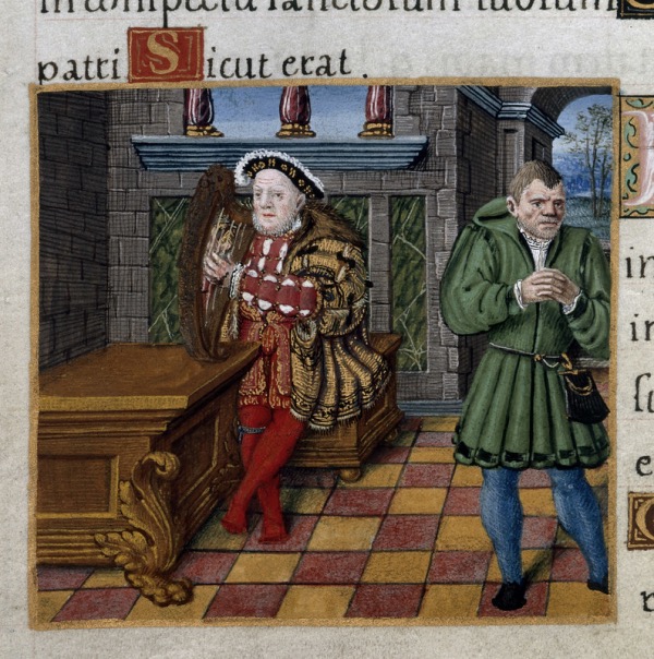 King Henry VIII as David, seated with harp, in an interior with his jester, William Sommers; illustrating Psalm 52. Taken from Psalter of Henry VIII (1530-1547).
