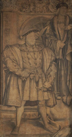 The mural featured the King standing in full splendour, although without typical symbols of royalty such as a crown or sceptre, as well as his wife Jane Seymour, and his parents, King Henry VII and Queen Elizabeth of York. They were all standing around a central pillar upon which are inscribed verses in Latin extolling the Tudor dynasty.