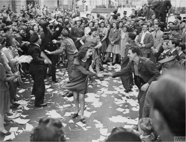 British girls, of the Picture Division of the London Office of War Information dance in the street with American soldiers during the “VE Day” celebration in London. This scene took place outside the building of the US Army Pictorial Division has its offices. PICTURE: © IWM EA 65796
