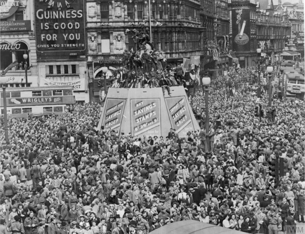 A mass of civilians and servicemen crowding around Piccadilly Circus, London. PICTURE: Poznak Murray, United States Army Signal Corps official photographer/© IWM EA 65879