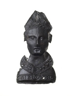 Pilgrim badge in the shape of a bust of St Thomas Becket wearing a mitre and inscribed ‘T:H:O:M:A:S’. PICTURE: © Museum of London.