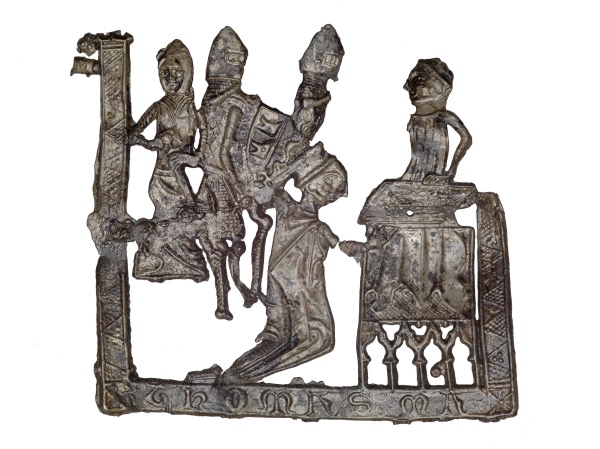 This pilgrim badge depicts the scene of Becket’s martyrdom. An inscription at the base of the badge reads ‘THOMAS MA’ (meaning ‘Thomas Martyr’). Becket is on his knees in front of an altar with a number of knights attacking him. Behind the altar stands the figure of Edward Grim, a clerk who tried to stop Becket’s murder. One of the knights carries a shield with two bears’ heads on it, identifying him as Reginald Fitzurse (through the visual pun on the Latin ‘ursus’, meaning ‘bear’). Fitzurse was the knight popularly believed to have struck final blow that killed Becket. PICTURE: © Museum of London.