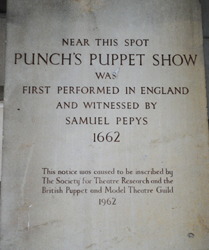 Mr Punch reached the height of his popularity in the Victorian and Edwardian ages and could typically be seen carrying on in seaside resorts across the country. The dramatic decline in his popularity since means it can be harder to find a Punch & Judy show today (and even when you do, much of his more brutal antics have been excised from plays so as not to offend modern sensibilities), but it’s still possible to see Punch and Judy performances in many places across the UK including, on occasion, at Covent Garden where there is a plaque (shown above) commemorating the performance seen by Mr Pepys.