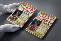 • Sherlock Holmes and his relationship to London, the city in which he lived, is the focus of a new exhibition which opens at the Museum of London from Friday. Sherlock Holmes: The Man Who Never Lived and Will Never Die, the first major temporary exhibition on Sir Arthur Conan Doyle’s famous character to be held in London in more than 60 years, will look at his literary origins and his relationship with late 19th century London, through to his portrayal in popular culture including through stage and screen performances starring everyone from Peter Cushing to Jeremy Brett and Robert Downey, Jr. Highlights of the exhibition include Conan Doyle’s notebook containing the first ever lines of a Sherlock Holmes story and notes in which he experimented with names for his to leading characters (later Holmes and Dr John Watson), a rare oil on canvas painting of Conan Doyle painted by Sidney Paget in 1897 which has never before been on public display in London, the original manuscript of 1903’s The Adventure of the Empty House, the Belstaff coat and the Derek Rose camel dressing gown worn by Benedict Cumberbatch from the BBC series and original pages from Edgar Allan Poe’s 1841 hand-written manuscript of The Murders in the Rue Morgue (Poe was an important influence on Conan Doyle’s writings). The exhibition will also include paintings, drawings, illustrations and photographs of Victorian London along with a vast collection of objects from the period. Runs until 27th April. Admission charge applies. For more, see www.museumoflondon.org.uk/sherlock. PICTURE: Two editions of A Study in Scarlet in which Conan Doyle introduced Holmes and Watson, Beeton’s Christmas Annual 1887.