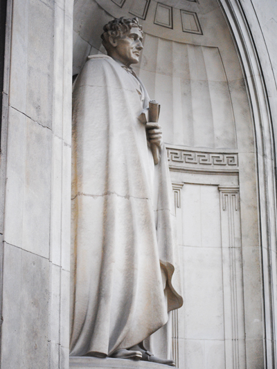 Congrats to Mike, Debbie, Janet, and Zoe (on Facebook), this is indeed the back of the statue of Hodge the cat in Gough Square in the City of London, just outside Dr Johnson’s House at No 17. One of the cats of the famed lexicographer, Dr Samuel Johnson, Hodge had his own moment of stardom in James Boswell’s Life of Johnson in which Dr Johnson is heard remarking that he’s had better cats than Hodge before, apparently in response to Hodge’s reaction, stating that he was “a very fine; a very fine cat indeed” (Johnson was apparently unusual for his love of cats; Boswell did not suffer the same love). This bronze statue of Hodge, by sculptor Jon Bickley and placed here in 1997, has Hodge sitting on a copy of Dr Johnson’s famous dictionary and beside him is some empty oyster shells, referring to Dr Johnson’s habit of buying oysters for his cats to eat. For more on Dr Johnson’s House (where Dr Johnson lived from 1747-59), see www.drjohnsonshouse.org.