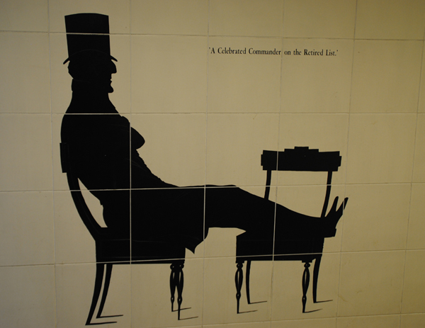 This image is one of many found in a subterranean tunnel surrounding Hyde Park Corner Underground Station and depicts, of course, the 1st Duke of Wellington, Arthur Wellesley, enjoying his latter years. The ‘Iron Duke’ has strong connections to Hyde Park Corner – his former home, Apsley House, No 1. London, is located there as is the Wellington Arch, the Decimus Burton memorial to him. For more on the Duke, see our earlier post here and for more on Wellington Arch, see our earlier ‘Where is it?’ post here.