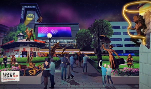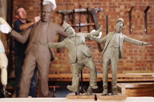 Laurel & Hardy, Bugs Bunny, Mr Bean and Mary Poppins are among the big screen icons who are coming to Leicester Square as part of a new art installation taking up residence from late February. Scenes in the Square, an initiative of the Heart of London Business Alliance in partnership with Westminster City Council and major film studios, celebrates a century of cinema with a “trail” of interactive bronze statues. Other characters include Gene Kelly – hanging off a lamp-post as he appeared in 1952’s Singin’ in the Rain – and more modern heroes like Batman and Wonder Woman. Paddington will also be present with visitors able to sit on a bench and have lunch beside him. Several of the eight statues will be illuminated at night and the trail will be enhanced with interactive content including maps, video and music. It is hoped further characters will be introduced following a six month pilot period. PICTURES: Above – An artist’s impression of what the square will look like; Below – Models of Laurel and Hardy with the life-size Laurel and sculptor David Field in the background.