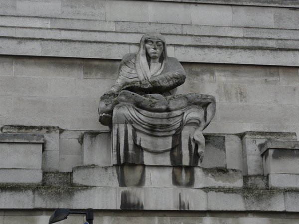 PICTURES: Top – Epstein’s ‘Night’ – One of the less controversial sculptures adorning the building (Loz Pycock (licensed under CC BY-SA 2.0))/Right – The mass of 55 Broadway with the controversial (and altered) sculpture of ‘Day’ (David Adams).