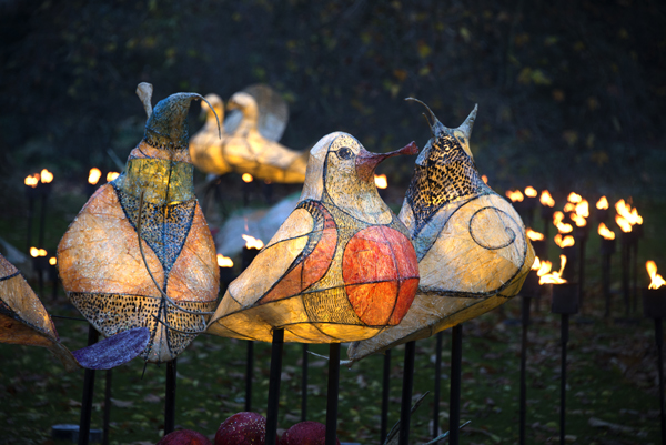 kewaMore than 60,000 lights are being used to illuminate Kew Gardens this Christmas in a mile long trail through the foliage. The trail features eight newly commissioned installations from UK and international artists including Bloom – a display of 1,700 swaying flowers by the group Squidsoup (above), and the roaring scented Fire Garden – a display themed around the Twelve Days of Christmas by And Now: (pictured below are three French hens from the installation). The trail also features Wolfgang Buttress’ bee-inspired installation, known as the The Hive (pictured second below), which has been lit with 1,000 LEDs that pulsate and glow against the night sky, and finishes with an “explosion” of brightly coloured laser beams across the Palm House Pond (pictured third below). There’s also a panto featuring Santa and his elves and a Victorian carousel. The night lights can be seen until 2nd January. Admission charge applies (and there’s timed entry). Kew is also running a program of family-oriented Christmas activities during the day across the period. For more, see www.kew.org. PICTURES: Jeff Eden, RBG Kew.