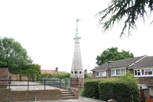 Now Grade II-listed, the spire, features a distinctive weathervane (variously described as a wolf’s head or a dragon’s head). Mounted on a brick plinth, it still stands at the location, now part of a more modern housing estate, just off Round Hill in Sydenham.