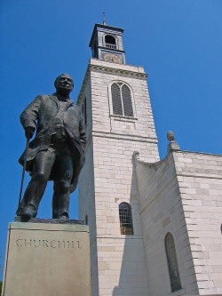 The church is now one part of the National Churchill Museum, which also includes a museum building and the ‘Breakthrough’ sculpture made from eight sections of the Berlin Wall. It was selected for the memorial – planned to mark the 20th anniversary of Churchill’s speech – thanks to its destruction in the Blitz, commemorating in particular the inspiring role Churchill had played in ensuring the British people remained stalwart despite the air raids.