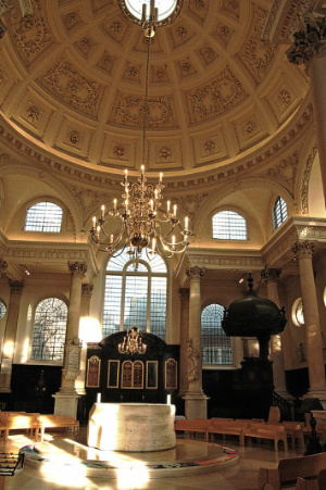 Designed to a rectangular form by Wren (and it’s certain this design was that of Wren himself), the church features a dome located toward the east end supported by eight Corinthian columns with the interior light by sizeable windows at the east end. A tower stands at the west end. The altar, a modern design by Henry Moore, sits under the centre of the dome.