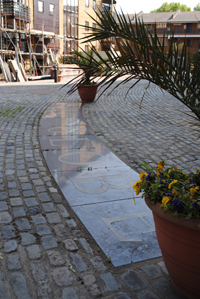 You can see the original site of The Globe just in nearby Park Street. The shape of the structure is marked by a dark line embedded in the pavement (pictured).