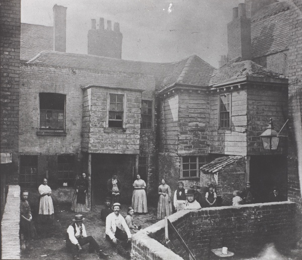 Above – Residents pose for the camera in Market Court, Kensington in 1868.