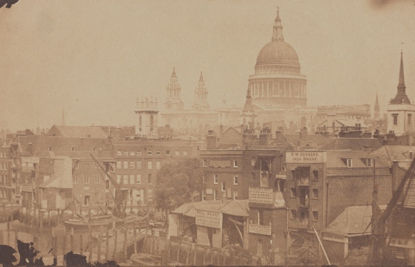 View of Iron Wharf and Bull Wharf, with St Paul’s Cathedral in the background. The photograph was taken from Southwark Bridge. Anonymous photographer, c. 1855.