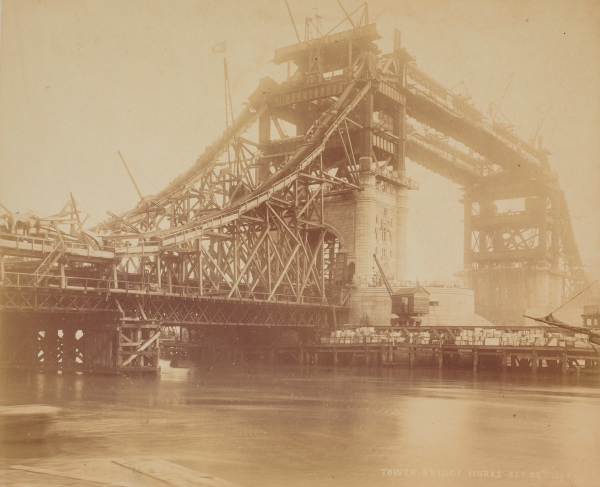 Above – Work progresses on the masonry and suspension chains during the construction of Tower Bridge in 1892.
