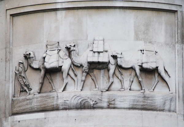 Well done to Carol Stanley – this is indeed located at 20 Eastcheap in the City of London. The building on the facade of which this relief of a camel train sits was formerly the offices of Peek Bros & Co, dealers in tea, coffee and spices. Peek House was built in 1883 after the previous structure, along with others on this side of Eastcheap, was demolished to make way for the Underground’s Metropolitan Line. The picture was carved by William Theed the Younger, who also sculpted the Africa group – including camel – on the Albert Memorial.