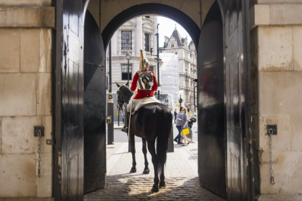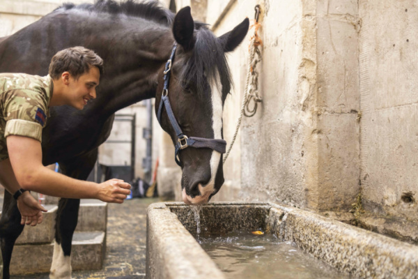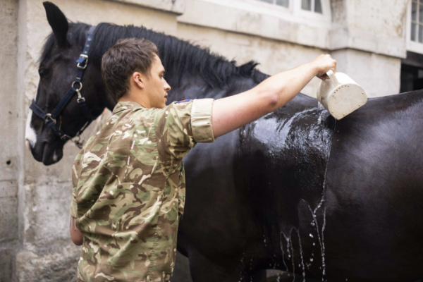 As London swelters, the Troopers of the Household Cavalry Mounted Regiment conducting the Queen’s Life Guard at Horse Guards take care to ensure their loyal horses are well looked after. That includes a hose off in the shade after duty to help them cool down, bobbing for in the water trough to help ensure they’re drinking enough and providing fans in the stables.