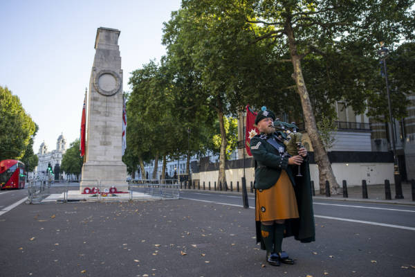 Lance Corporal James Bell plays the bag pipes in front of the Cenotaph to commemorate the 80th anniversary of Victory in Japan Day on Friday, 15th August. Lance Corporal Bell was one of six military pipers who performed solemn laments across the UK, the Far East, and aboard HMS Prince of Wales at sea, to honour the end of World War II and the sacrifices of the Commonwealth forces.