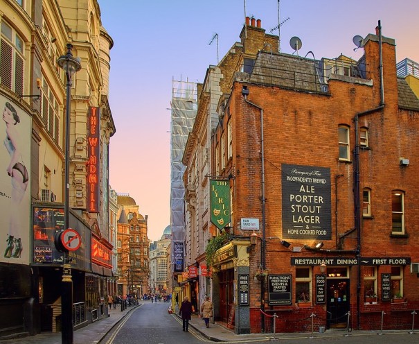 View down Great Windmill Street with The Lyric pub on the right and the former Windmill Theatre on the left (Pedro Szekely/licensed under CC BY-SA 2.0)