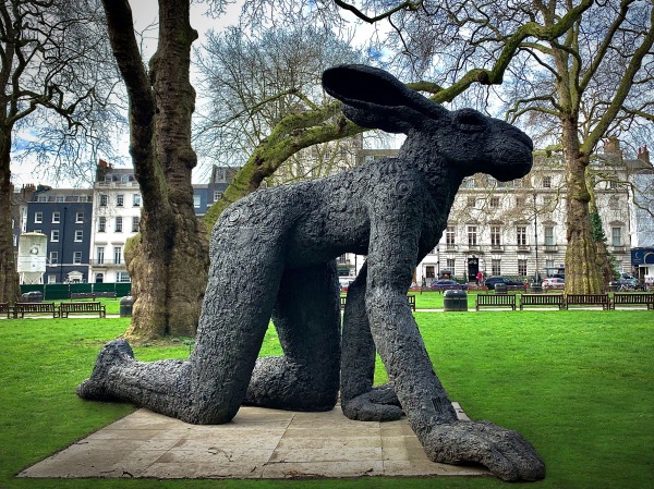 • A hybrid sculpture depicting the body of a woman with the head of a hare has gone on show in Berkeley Square. The work of Sophie Ryder, Crawling was hand-made in 1999 from wet plaster, old machine parts and scavenged toys then cast in bronze. The work is part of City of Westminster’s City of Sculpture programme which brings sculpture to iconic outdoor locations.