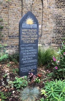 A new sundial and garden have been unveiled in Kensal Green commemorating the Windrush generation. The sundial, the work of carver Martin Cook, is located at St John The Evangelist Church which, according to its vicar, Rev David Ackerman, has relied upon the local Caribbean community to survive and thrive since the 1960s. The sundial has been made of a single piece of slate and carved with the words “Work Together, Pray Together, Struggle Together, Stand Up for Freedom Together” which are taken from Martin Luther King Jr’s famous ‘I have a dream’ speech. An official opening ceremony for the sundial – which was funded by Westminster City Council – was held earlier this month. In a statement, Jonathan Glanz, the Lord Mayor of Westminster, said he hoped the outdoor space would become a “beacon of peace and unity for the local community in troubled times”. PICTURES: Courtesy of the City of Westminster.